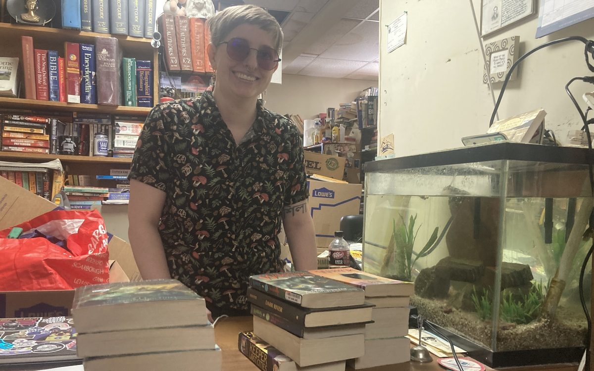 Fox Emm, one of the new owners of the Pro Libris bookstore on Third Street in Bangor, works the front counter on their first day as an owner. The store’s founder, Eric Furry, died last month. Credit: Kasey Turman / BDN